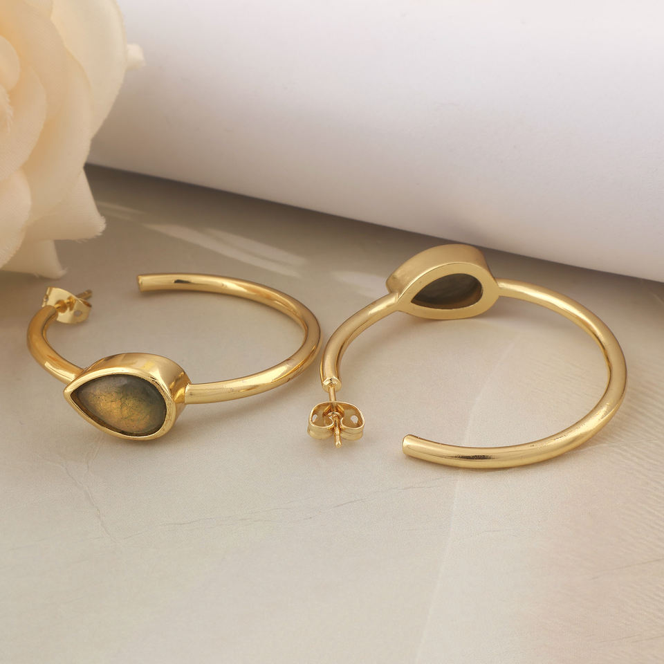 Women's elegant jewelry natural rainbow labradorite pear bezel set gold plated brass metallic classic hoop earrings for gifts