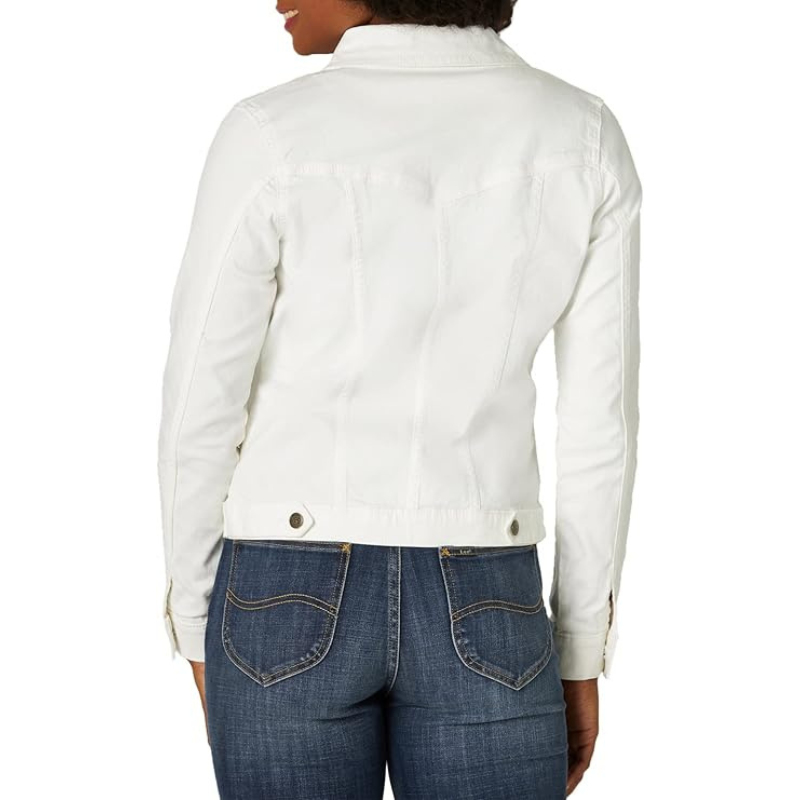 Women's white denim jacket with stretch fit. lightweight casual jean jacket for layering, travel, and everyday outfits.