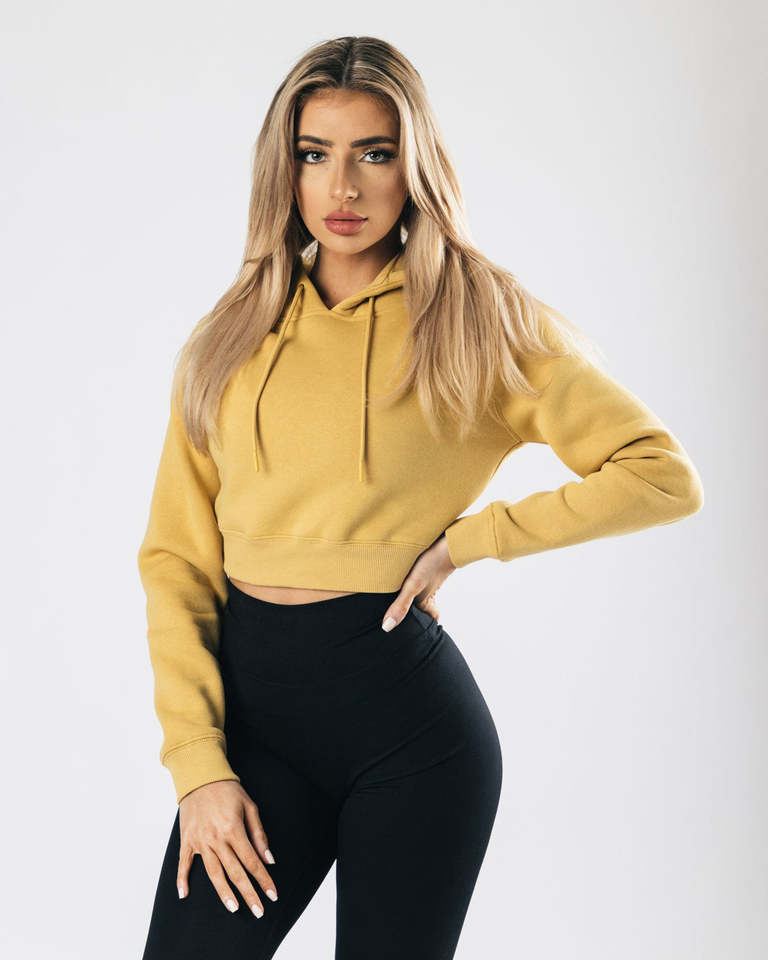 Women Yellow Regular Hoodie Soft Fleece Pullover Long Sleeve Stylish Midriff Sweatshirt Casual Daily Wear Winter Front