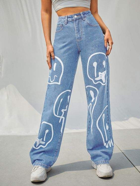 Womens Baggy Wide Leg Jeans Mid Rise Regular Fit Tie-Dye Blue Denim Lace Ruffles Designer Trousers Casual Streetwear
