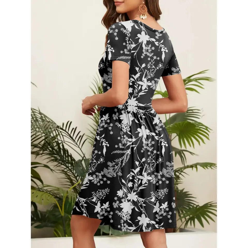 Womens Black Flower Printed Short Sleeve Dresses Casual Loose Fit Swing T Shirt Dress V Neck Sundress with Pockets From BD