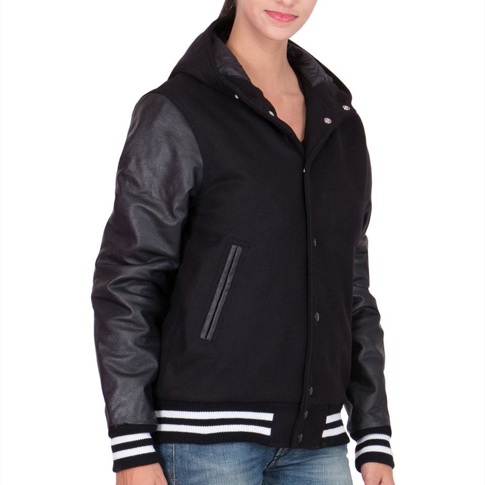 Womens Black on Black Hooded Varsity Jacket Wool Body Leather Sleeves Letterman Style Outerwear Ladies Casual Sporty Bomber Coat