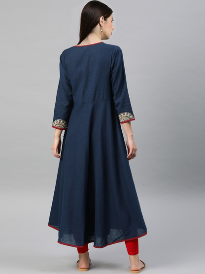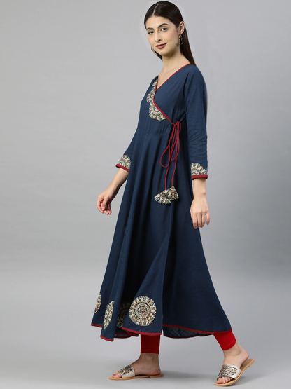 Womens Blue Cotton Slub Patch Work Angrakha Kurta With V Neck Three Fourth Sleeves Designed For Global Ethnic Casual Wear