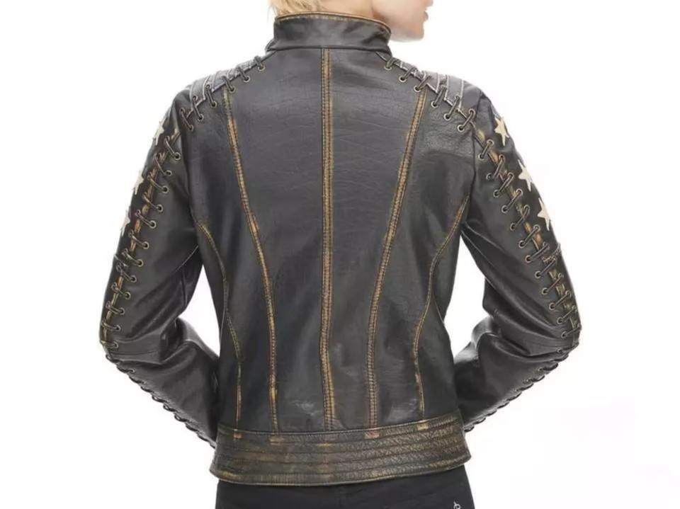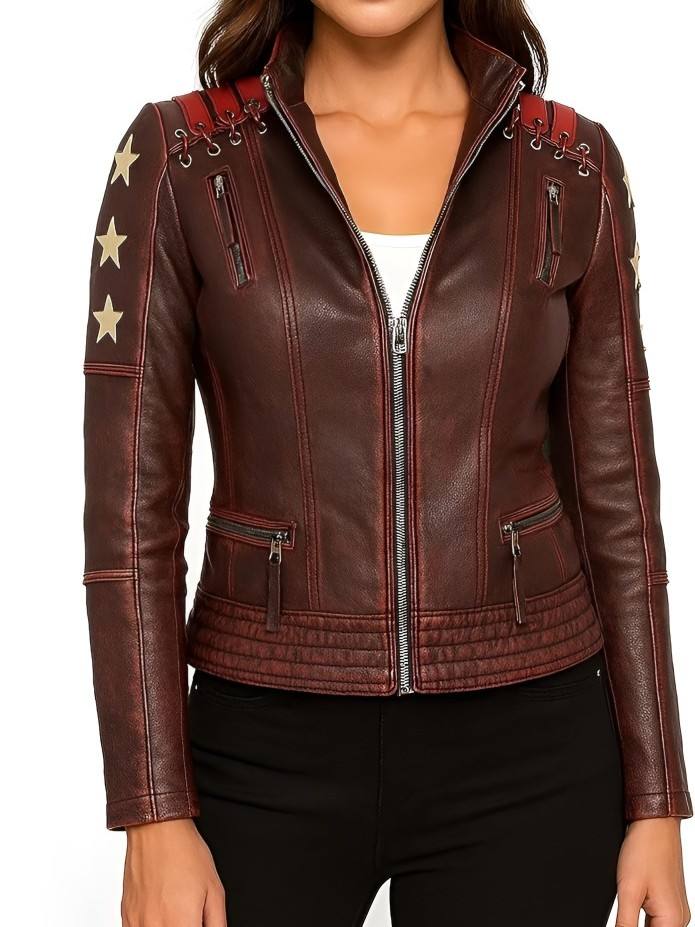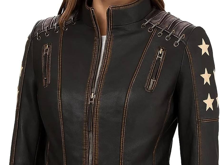 Womens Distressed Brown Black Leather Jacket With Stars Vintage Moto Coat Lace Up Biker Outerwear Zip Up Ladies Fashion Top
