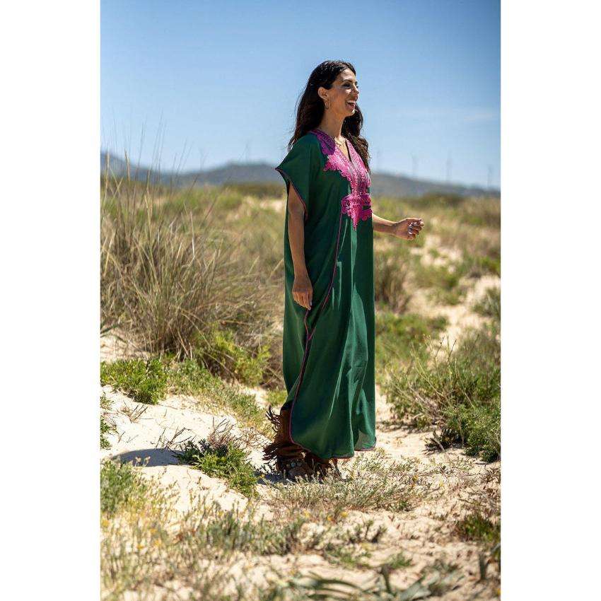 Womens Embroidered Kaftan Maxi Dress Green Cotton Blend Long Beachwear Caftan Resort Boho Ethnic Wear