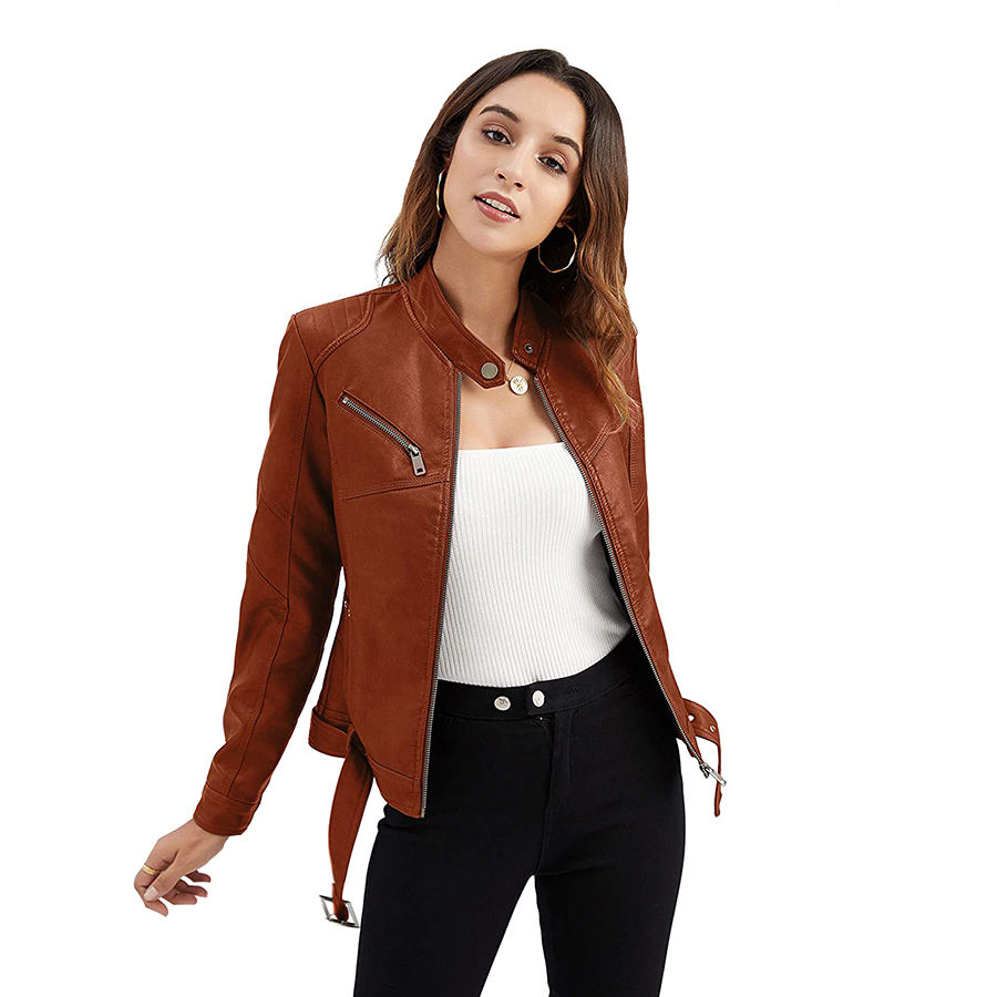 Womens Genuine Leather Tan Brown Biker Jacket Slim Fit Moto Coat Zipper Front Long Sleeve Edgy Stylish Casual Outerwear