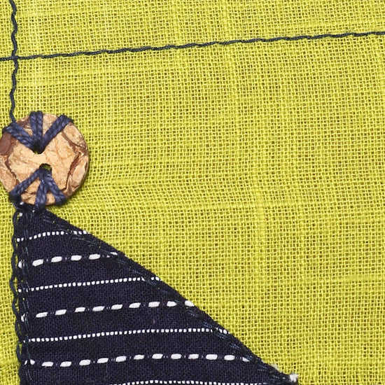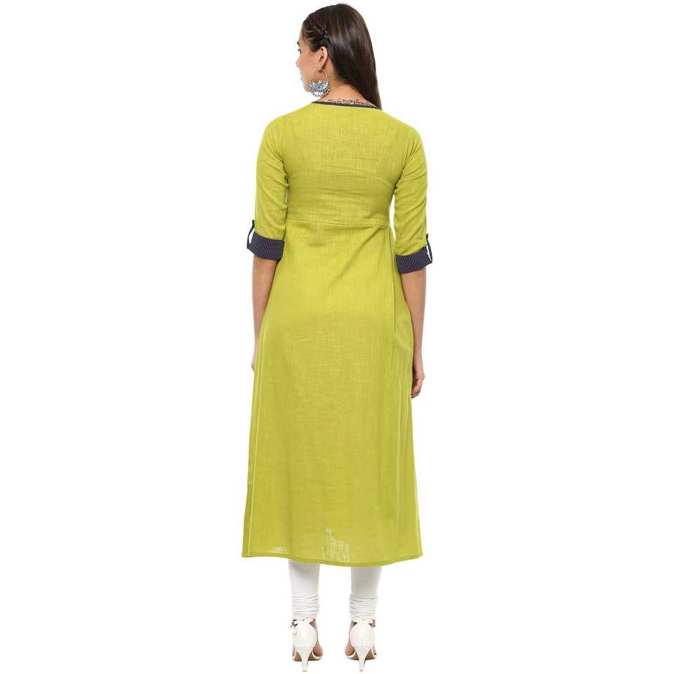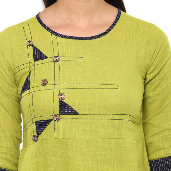 Womens Green Cotton Slub Patch Work A Line Kurta With Round Neck Three Fourth Sleeves Designed For Global Ethnic Casual Wear