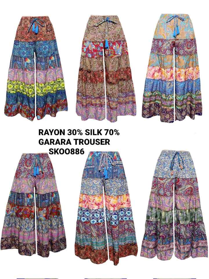 Womens Lightweight 70% Silk 30% Rayon Boho Garara Trousers Elastic Waist Boot Cut Pants for Casual or Resort Wear with Flowy Fit