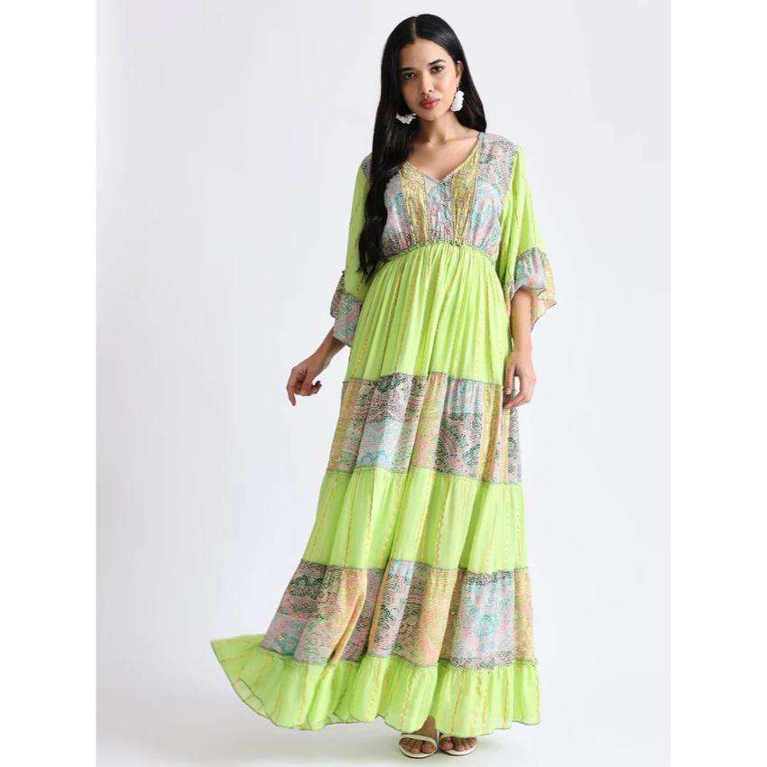 Womens Lime Green Printed Maxi Dress V Neck Empire Waist Long Dress With Sleeves Boho Ethnic Summer Wear Dress