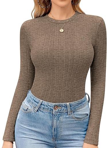 Womens Long Sleeve Ribbed Shirts Trendy Slim Fitted Tops Thermal Under Scrub Crew Neck Soft Fleece Tee