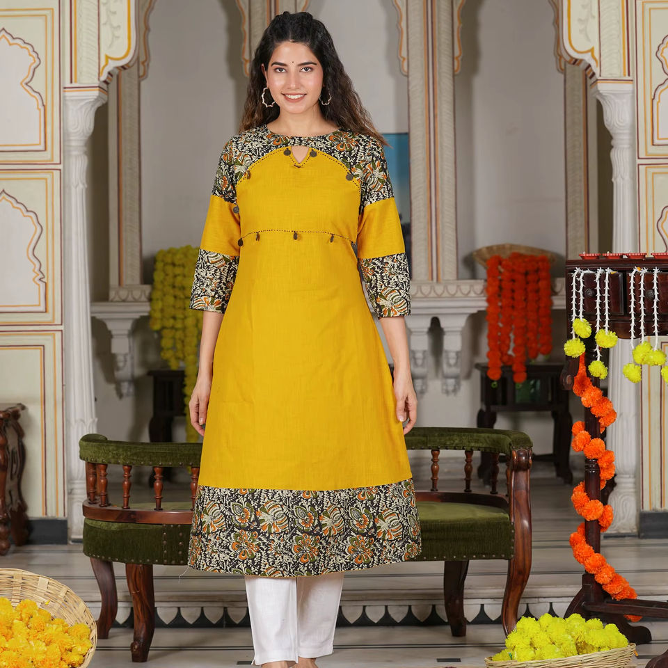 Womens Mustard Cotton Blend Kalamkari Printed A Line Kurta Kantha Work Keyhole Neck Three Fourth Sleeves Designed Global Wear