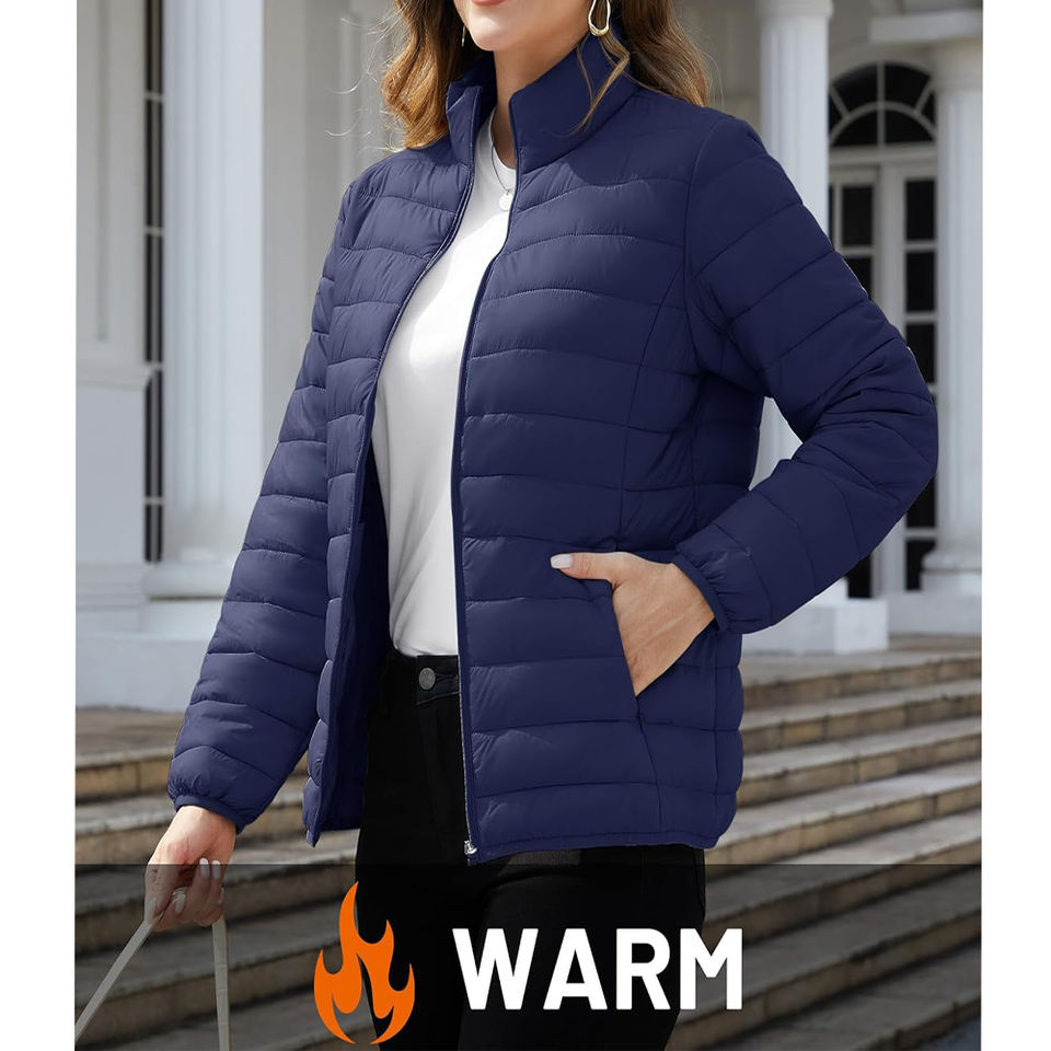 Womens Navy Blue Lightweight Puffer Jacket Packable Windproof Water Resistant Fall Winter Coat with Zippered Pockets and Warm