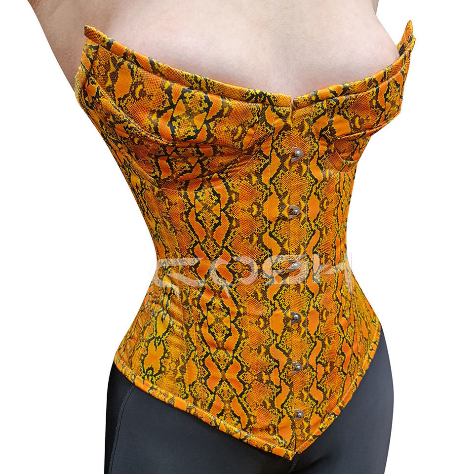Womens Orange Snakeskin Print Corset Bustier Sexy Strapless Waist Slimming Steel Boned Top for Party Fashion Wear