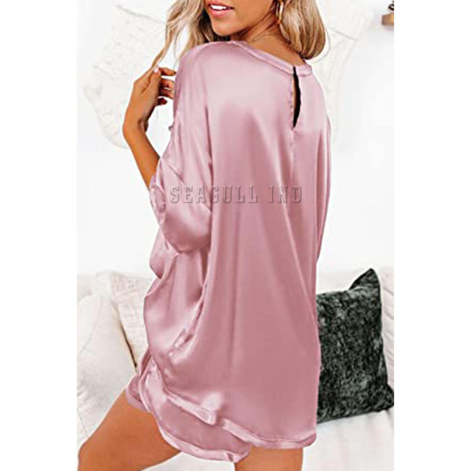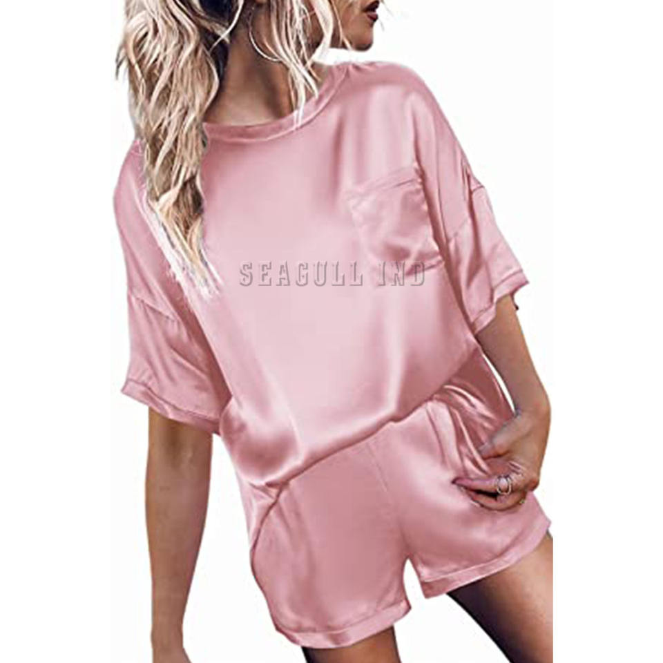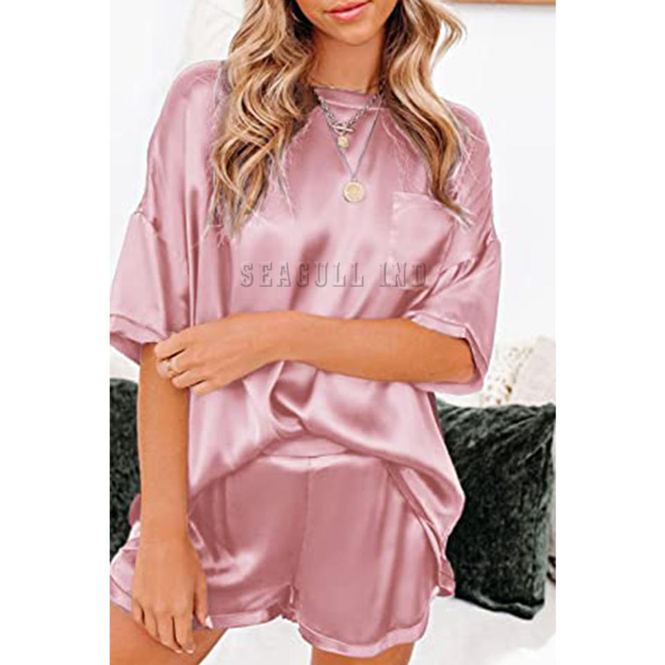 Womens Pajama pink Color Sets Button Down Shirt and Shorts Sleepwear Set
