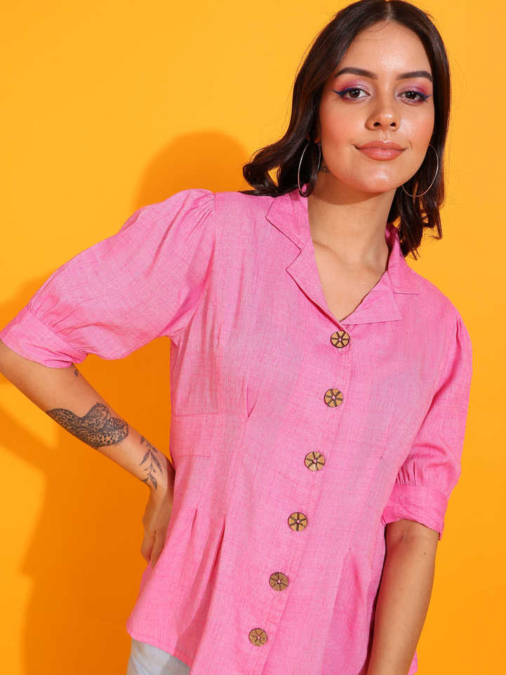 Womens Pink Cotton Solid Titan Top With Stylish Coat Collar And Short Sleeves Designed For International Casual Office Wear