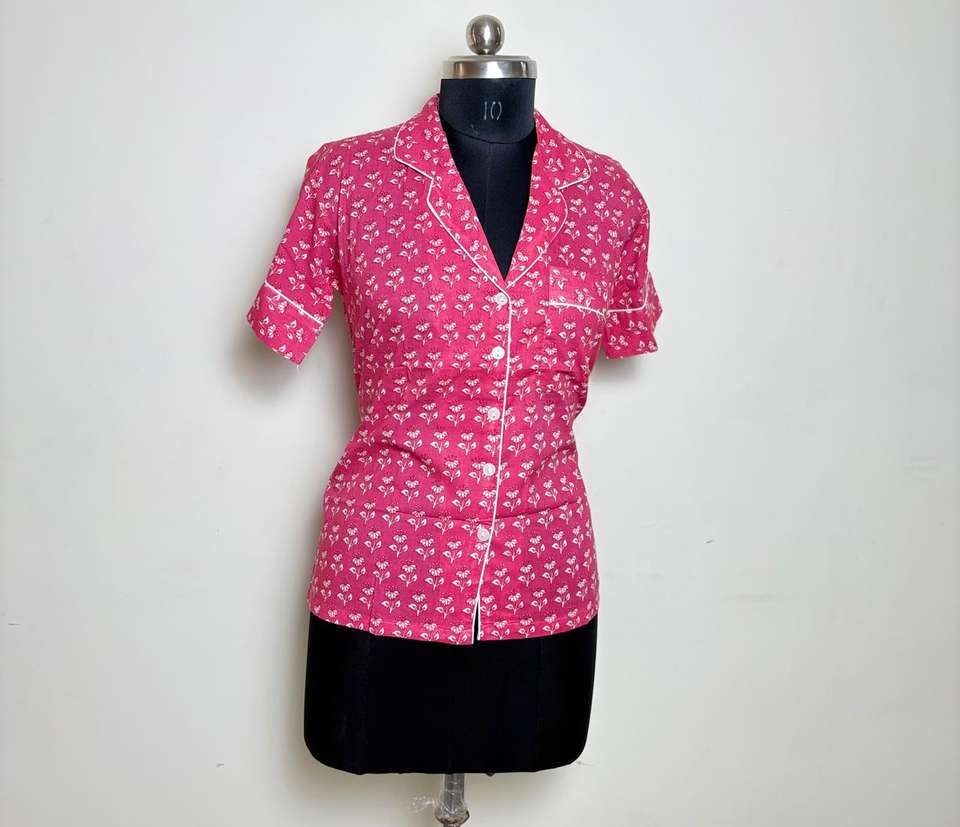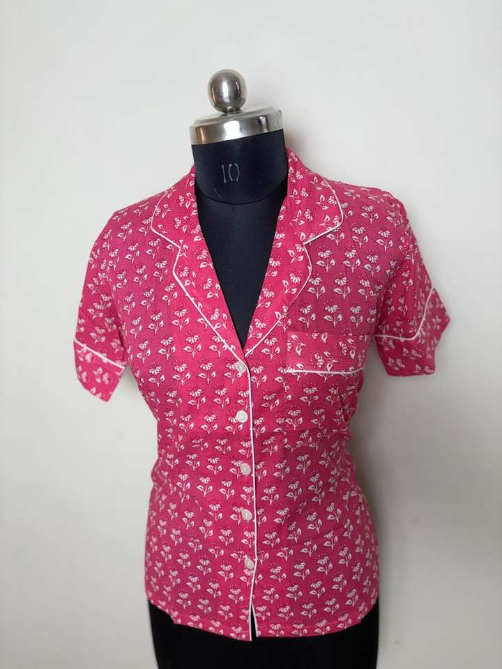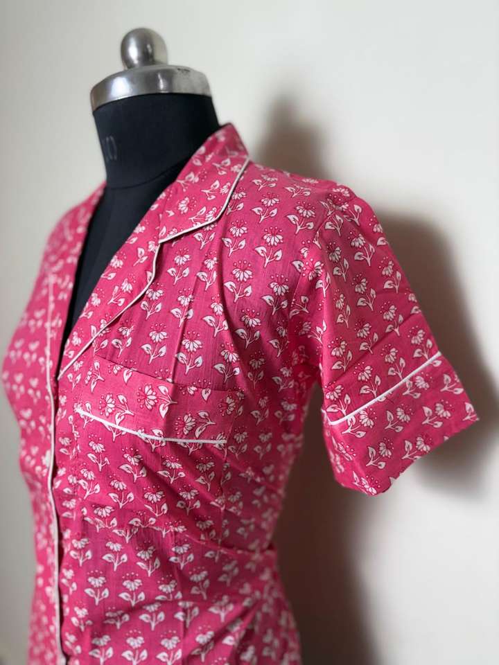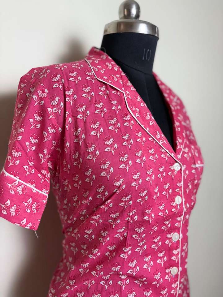 Womens Pink Floral Print Cotton Shirt Short Sleeve Casual Button-Down Shirt Pink with White Print