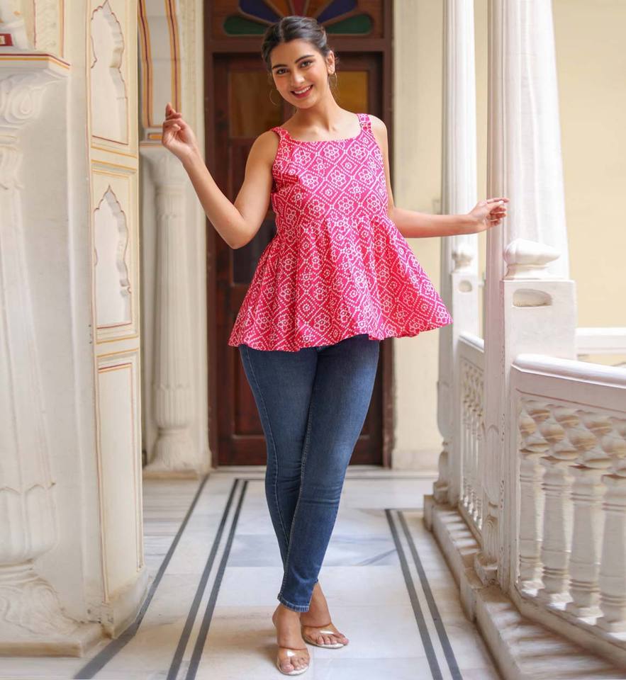 Womens Pink Rayon Bandhej Printed Regular Fit Sleeveless Top With Round Neck Designed For Global Casual Summer Everyday Wear