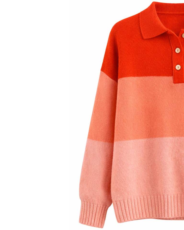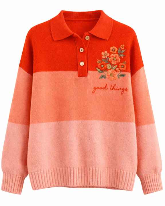 Womens Polo Collar Knit Sweater Orange Peach Colorblock Floral Embroidery Pullover Long Sleeve Winter Top Custom OEM Wholesale