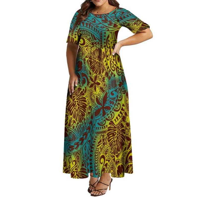 Womens Polynesian High Waist Maxi Dress Round Neck Short Sleeve Elegant Formal Banquet Dress