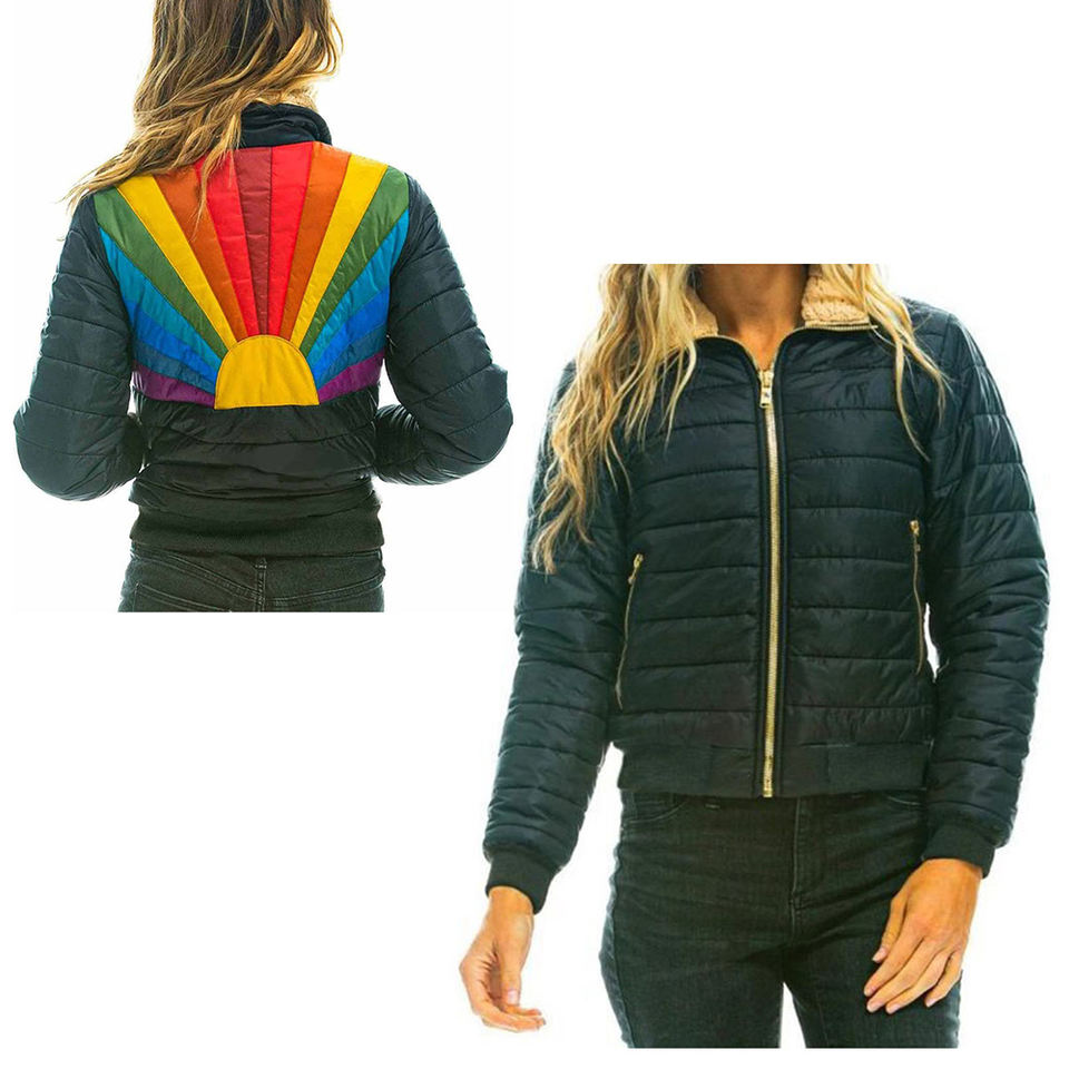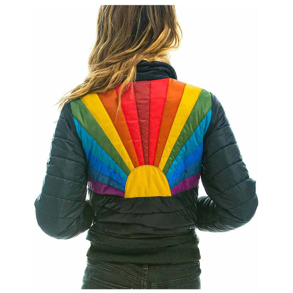 Womens Rainbow Puffer Jacket With Shirt Style Collar in Black Fashion Classic Puffer for Ladies Winter Women Clothing Collection