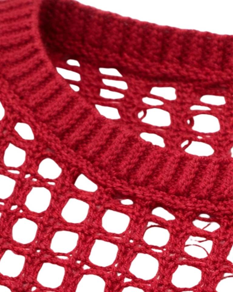 Womens Red Crochet Knit Cropped Sweater With Open Weave Design Long Flare Sleeves Fashionable Casual Streetwear Top