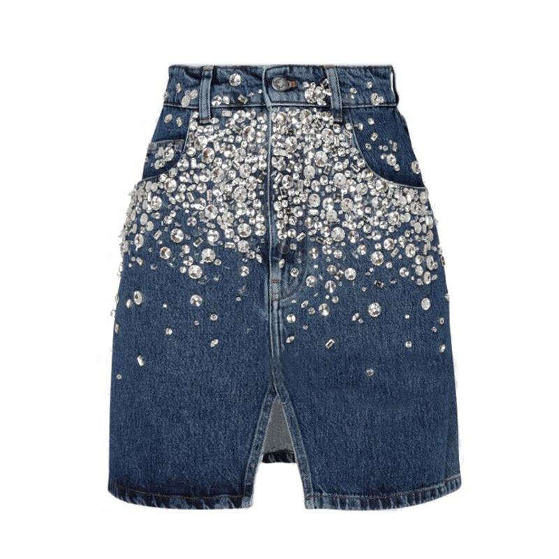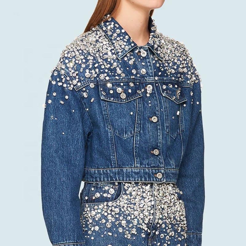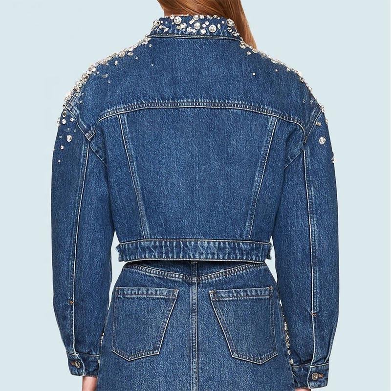 Womens Rhinestone Embellished Denim Jacket Sparkly Fashion Streetwear Trendy Long Sleeve Modern Outerwear Coat