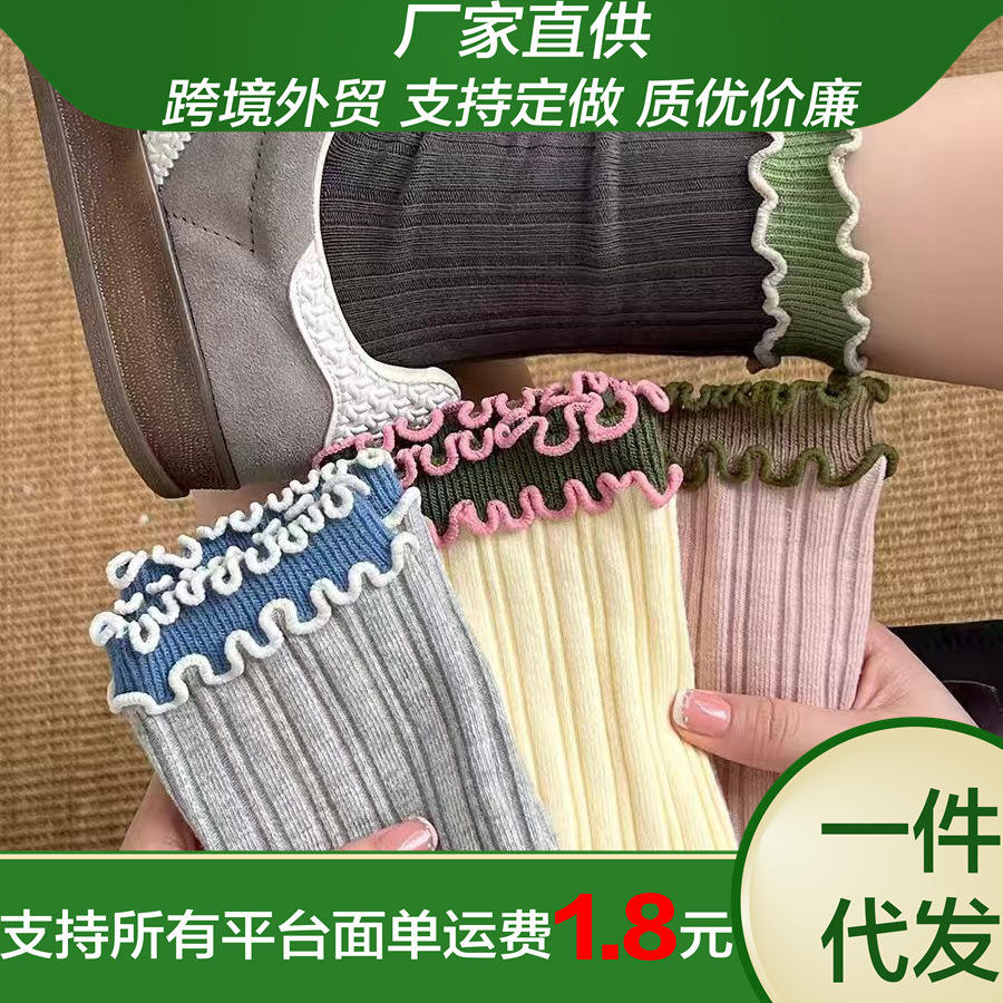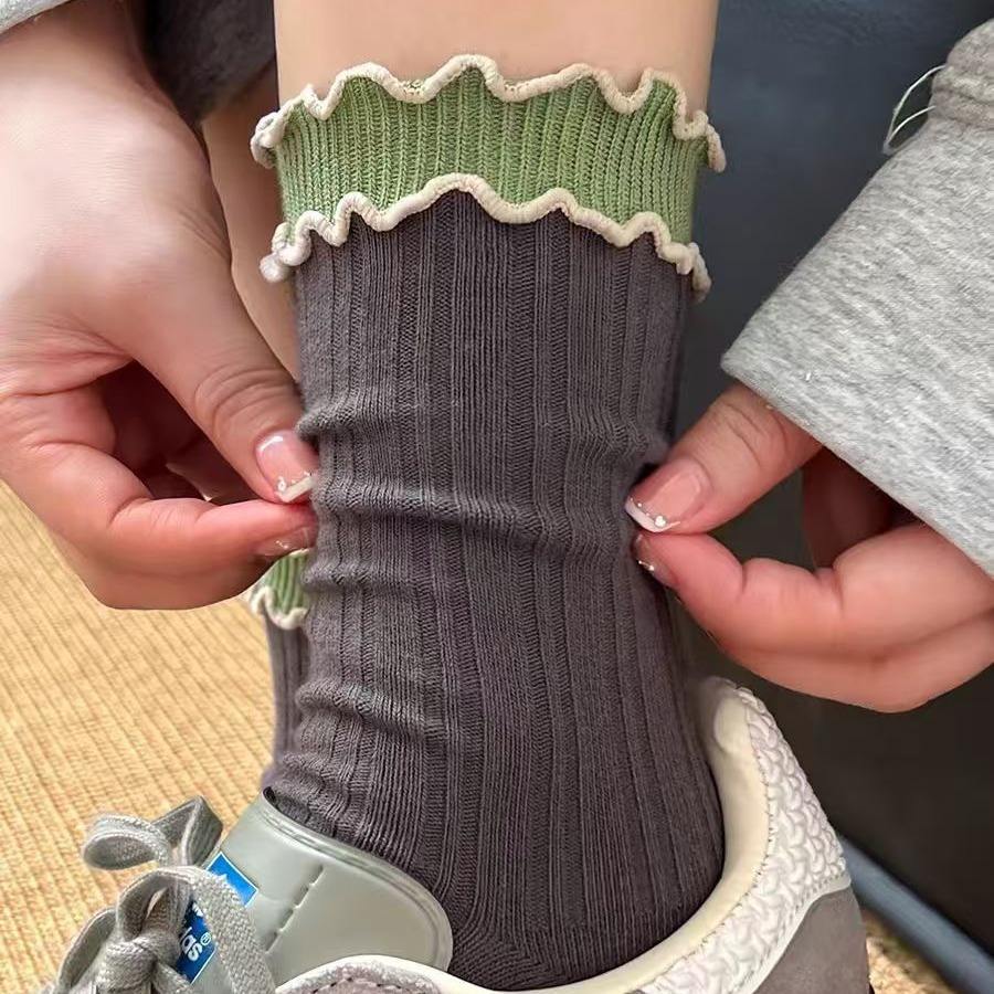 Womens Slouch Socks Gray Green Ruffled Trim Cotton Breathable Mid Calf Sock Youth Fashion