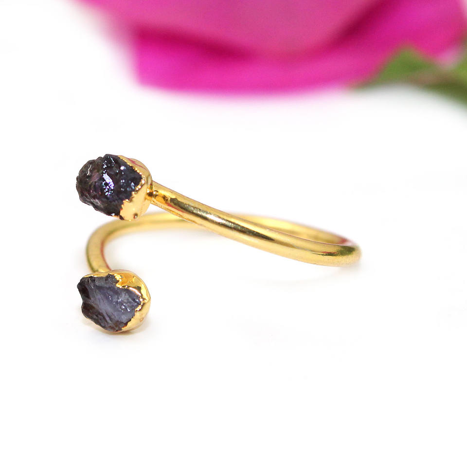 Womens Style Natural Raw Amethyst Gemstone Fancy Shape Double Stone 18K Gold Plated Free Size Ring Jewelry For Women Wholesale