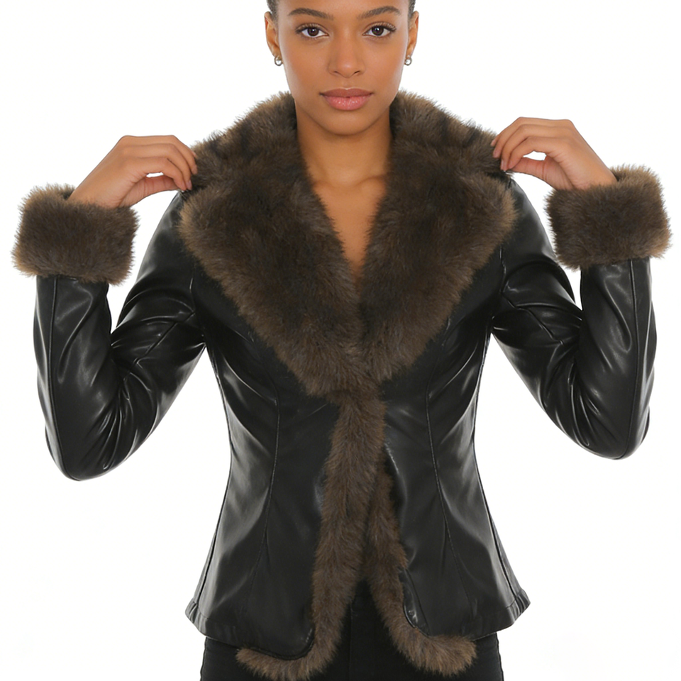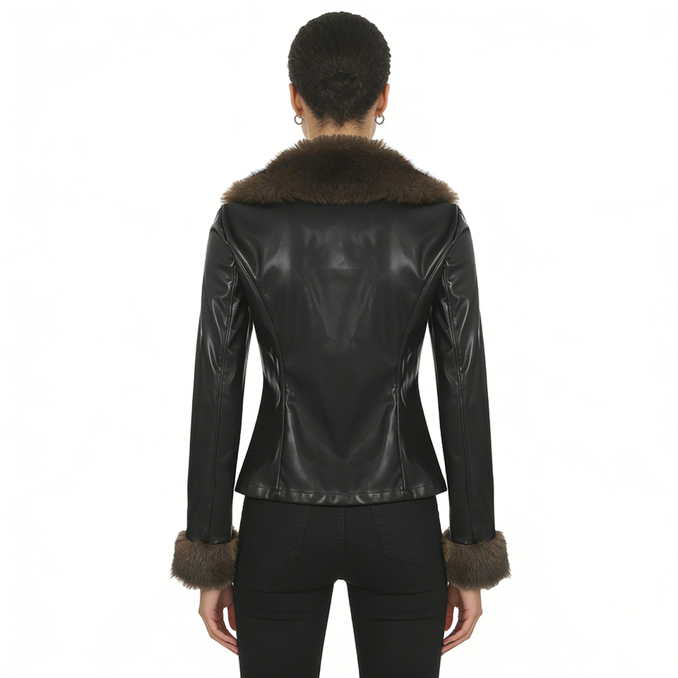Womens Trendy Cool Artificial Fur Patchwork PU Leather Utility Safari Waist Cinched Slim Fit V Neck Casual Long Sleeve Jacket