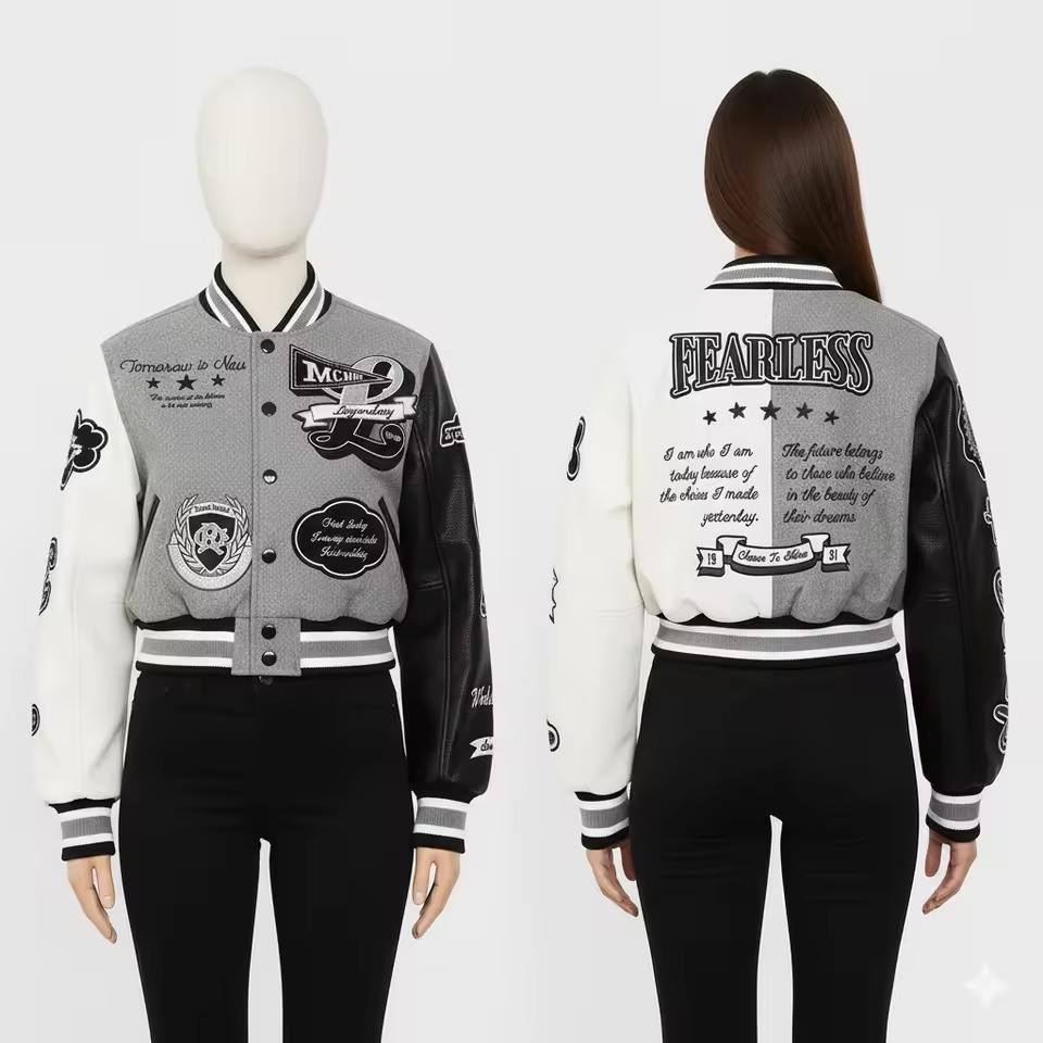 Women's Two-Tone Black & White Premium Varsity Bomber Jacket with Embroidered Patches Breathable Raw Cotton Shell