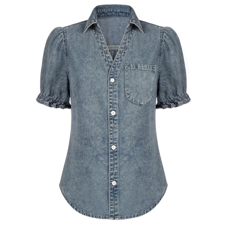 Product name:Womens Curved Hem Denim Shirt Short Flare Sleeve