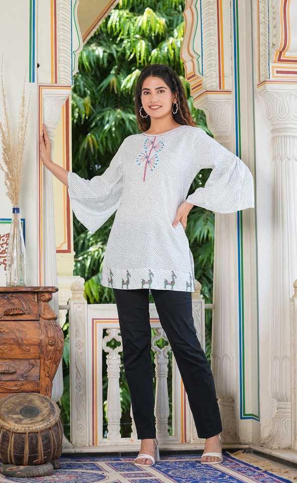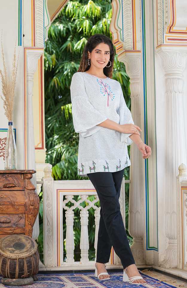 Womens White Rayon Embroidered Geometrical Printed Regular Fit Top With Three Fourth Sleeves And Round Neck Global Casual Wear