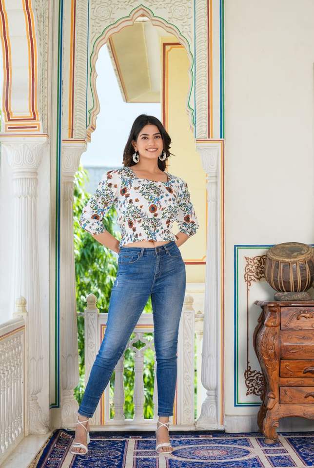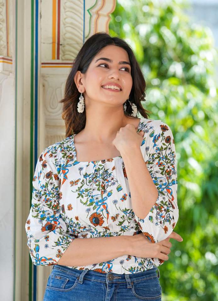 Womens White Rayon Floral Printed Smocked Regular Fit Top With Puff Sleeves And Square Neck Designed For Global Casual Wear