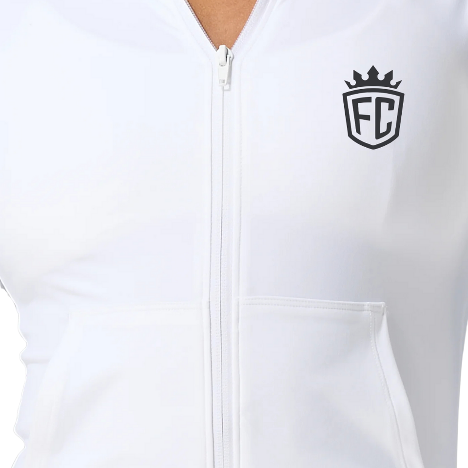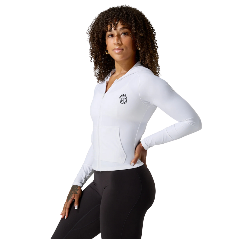 Womens White Zip Up Hoodie Stretch Performance Jacket Long Sleeve Fitted Activewear Top For Gym Training Yoga
