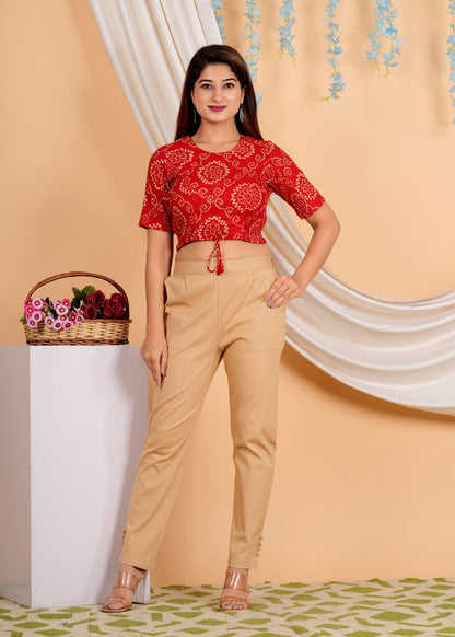 Womens cotton blouse in bandhej printed red colour blouse with round neck and short sleeves regular blouse comfort and fit