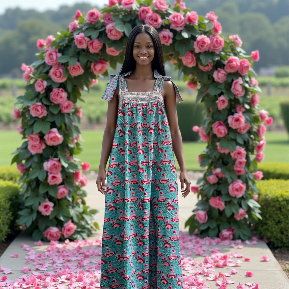 Womens sleeveless maxi dress with tie up straps square neckline and elegent lotus double borde design