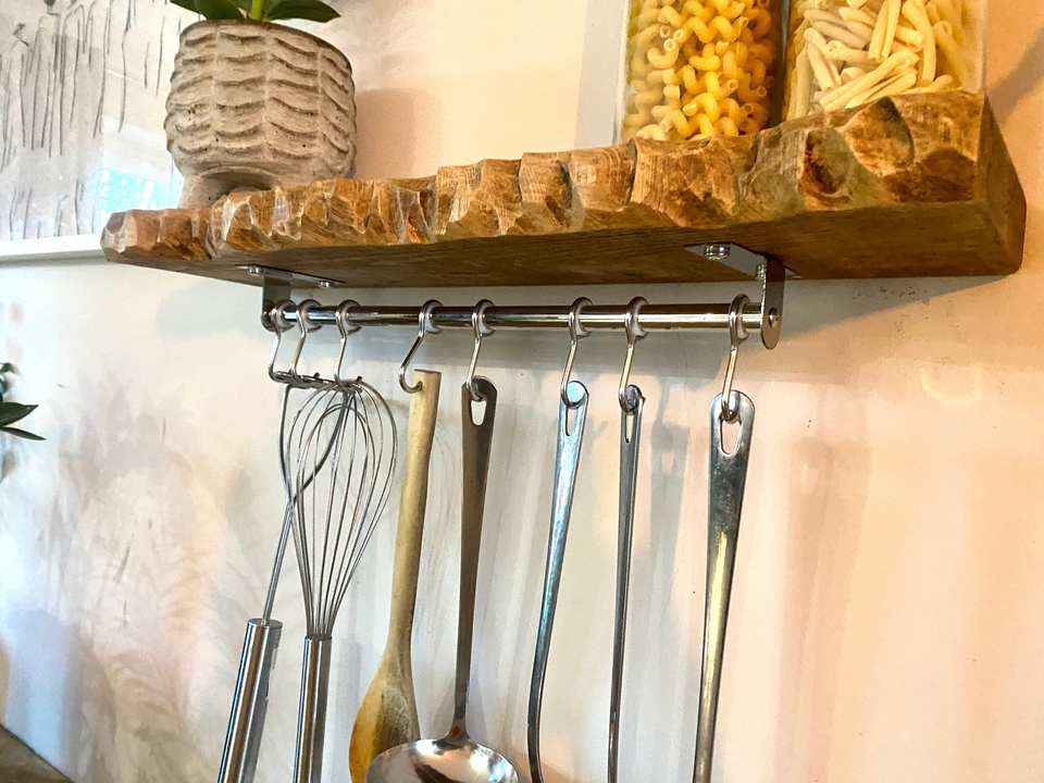 Wood Chunky Floating Shelf With Hidden Bracket Utensil Rack And Metal Hooks For Kitchen Display And Industrial Home Wall Decor