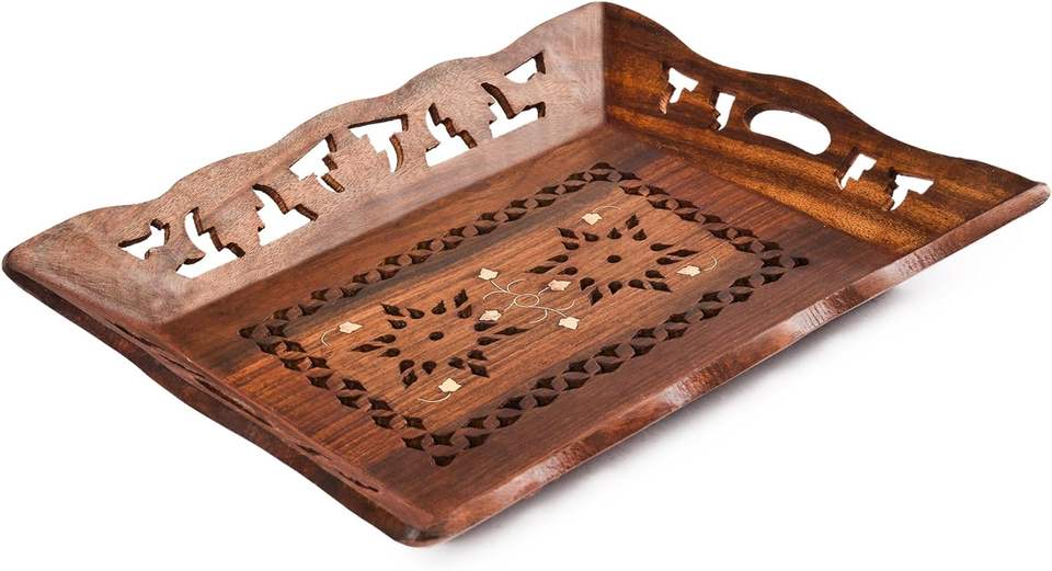 Wood Decorative Serving Tray for Hot & Cold Drinks/Vintage Rustic Decorative Handmade Sheesham Food Platter for Dining Tableware