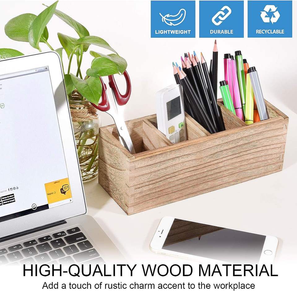 Wood Pen Pencil Holder for Desk Rustic Pen Organizer 4 Compartment Multi-Use Desktop Stationery Supplies Organizer Pencil Stand