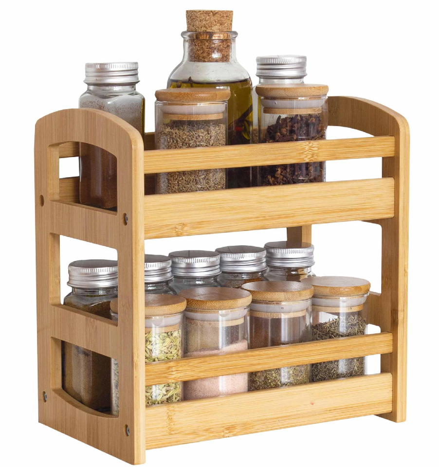 Wood Spice Jar Rack Space Saving 2-Tier for Countertop Kitchen Salt Seasoning Sustainable Rustic Spice Jar Rack