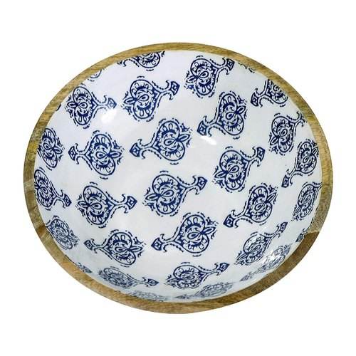 Wood Salad Serving White and Blue Enamel Printed Bowl Food Fruit Nuts Wooden Natural Kitchen Utensils Vegan Organic