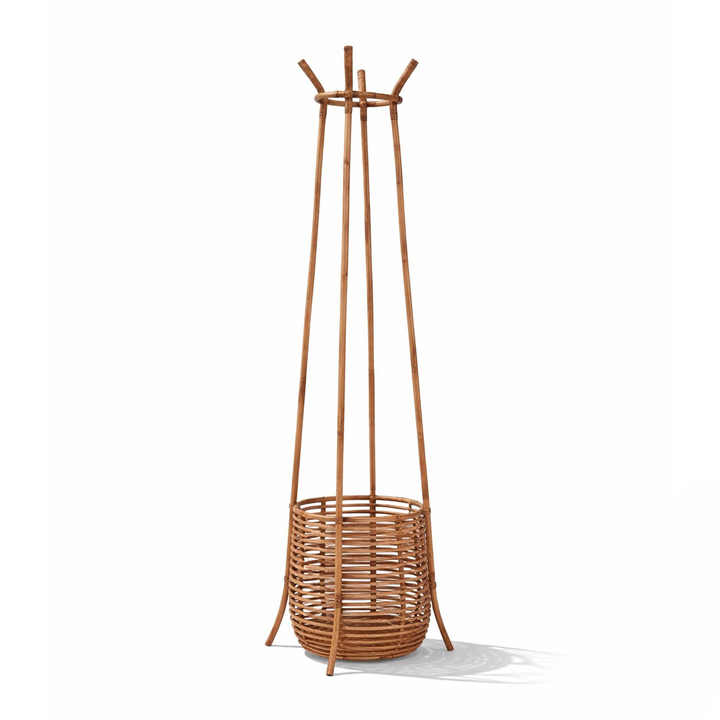 Wood single pole coat rack with basket handcrafted rattan wooden free standing cloth racks