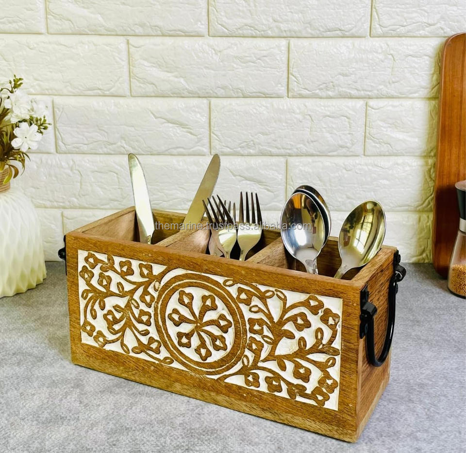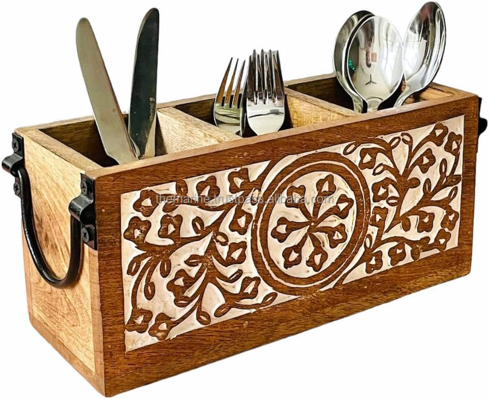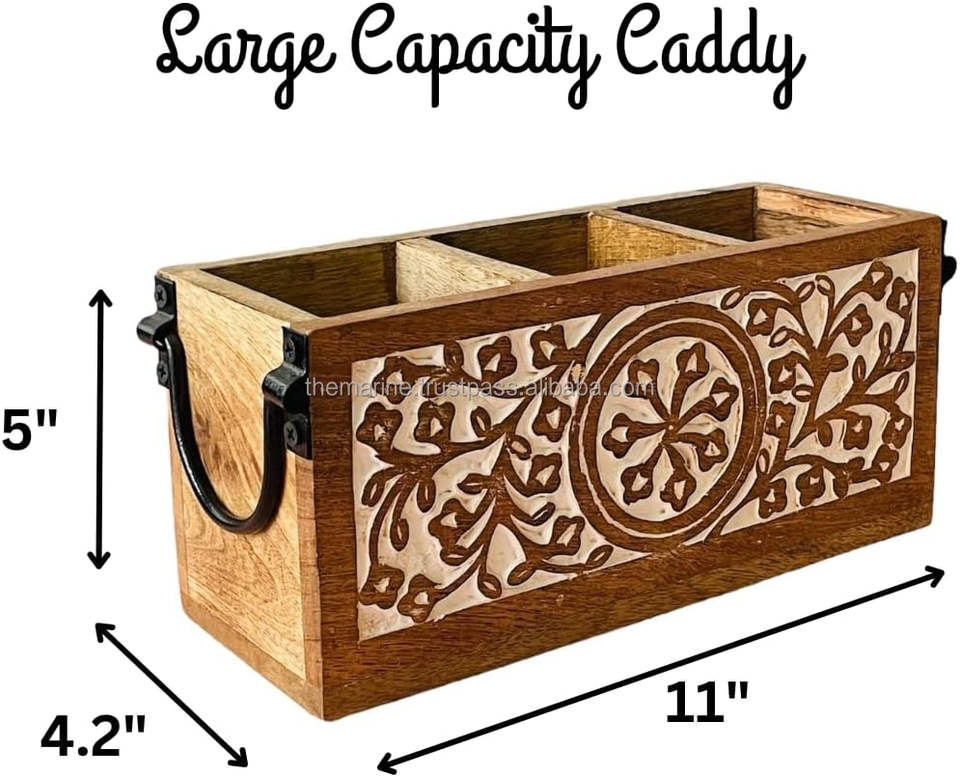 Wooden 3 Compartment Farmhouse Cutlery Holder Flatware Caddy with Metal Handles for Kitchen Counter Top