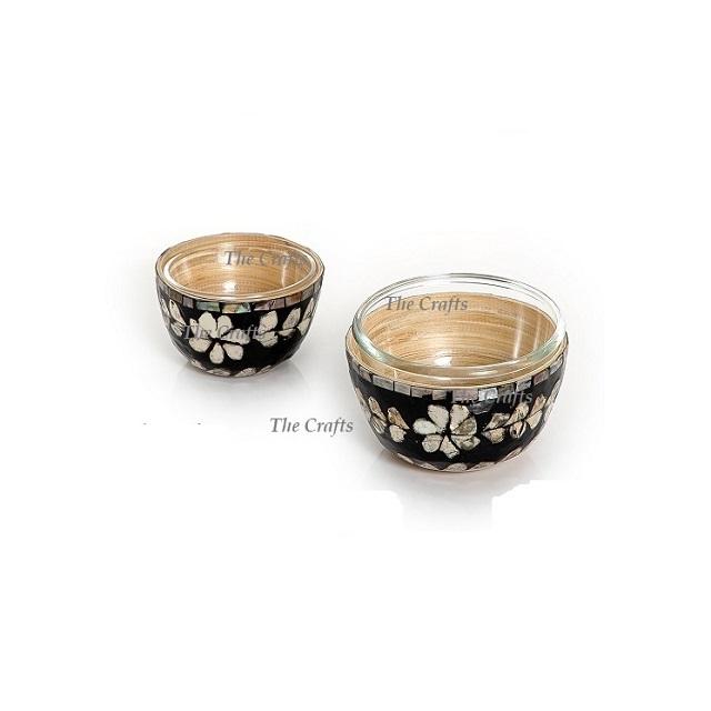 Wooden And Glass Serving Bowl With Mop Work Set Of Two Different Sizes Decorative Bowl In Black Color