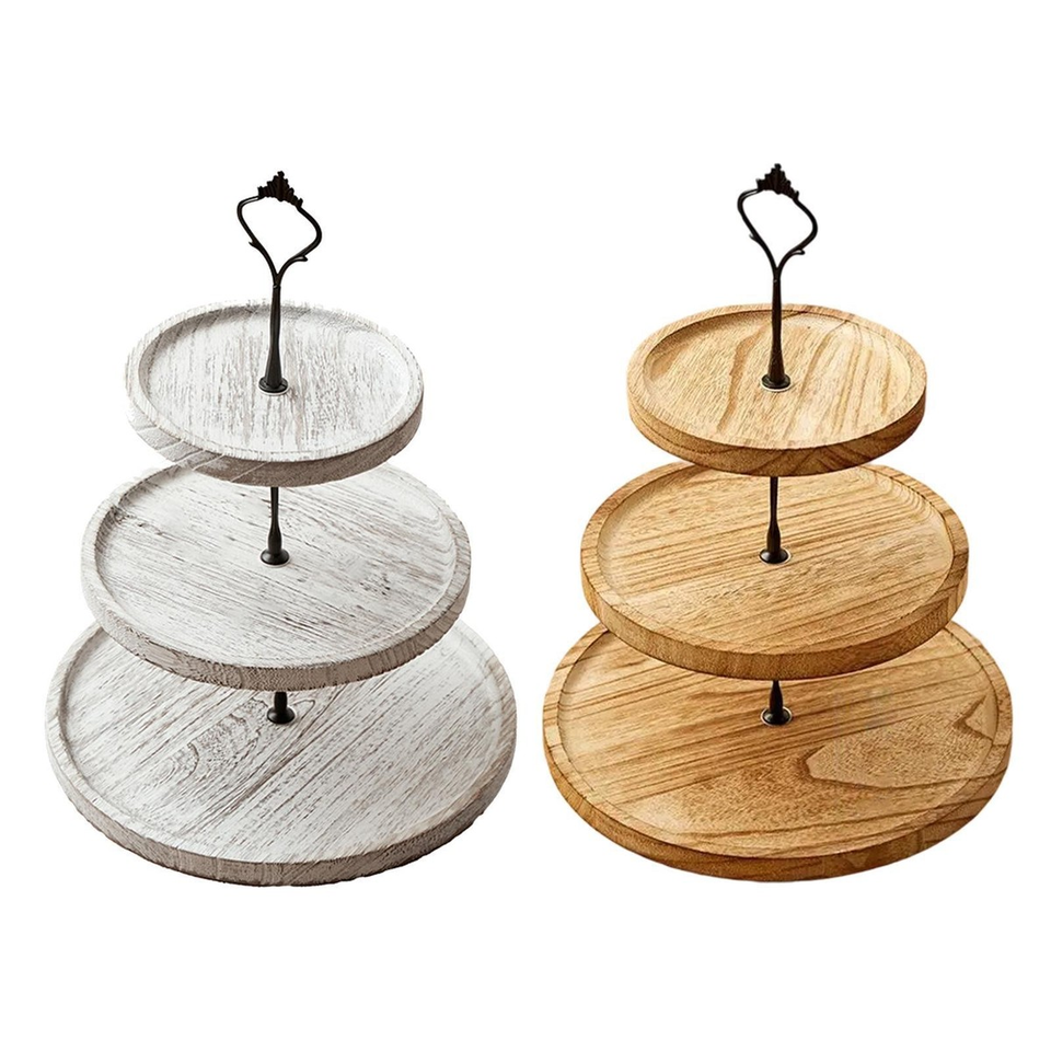 Wooden Cake Stand 3-Tier Metal Handle Natural Wood Color And Rustic White Printed Design Metal Handle Cupcake Stand