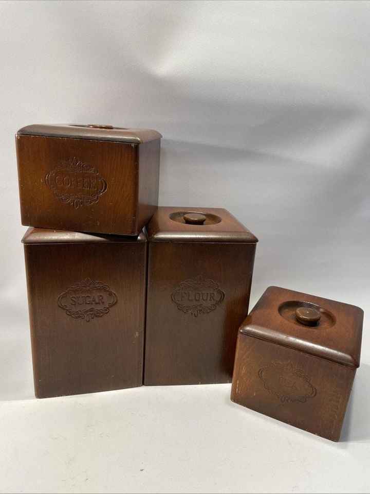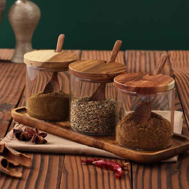 Wooden Canister Glass Jar Canister and Glass Seasoning Storage Box, Salt, Spices with Spoon Set of 3 Kitchenware & Dinnerware
