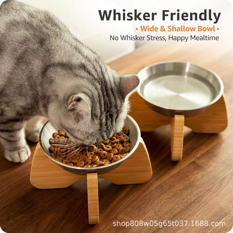 Wooden Cat Bowl Stand Elevated Feeder For Indoor Cats Rounded Design With Stainless Steel Bowls