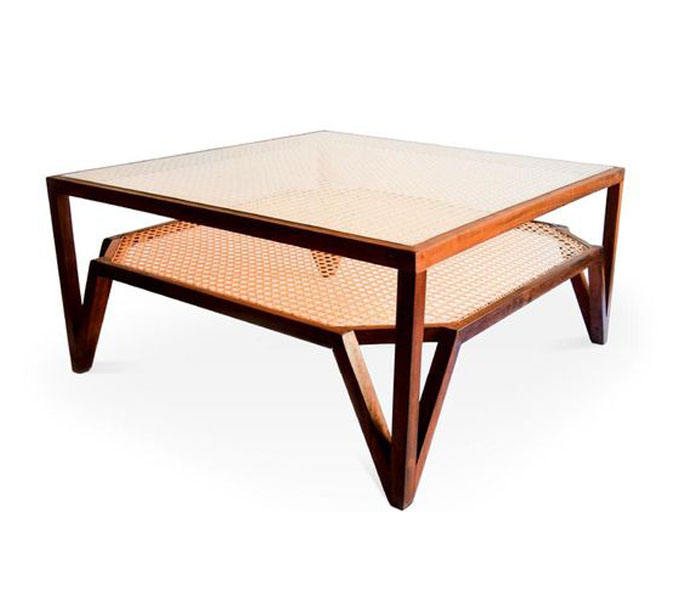 Wooden Coffee Table with Two Strands Using Natural Rattan with a Combination of Glass for the Table Top