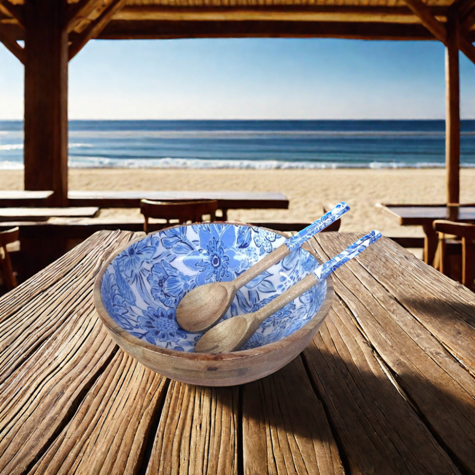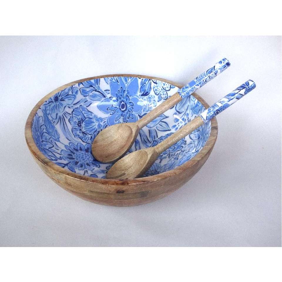 Wooden Decorative Bowl with Salad Server Blue Mango Wood Salad Server and Bowls Designer Wooden Bowls With Salad Sets