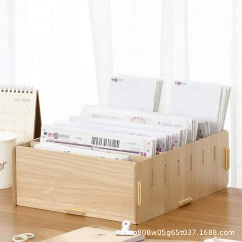 Wooden Document Organizer Box Rectangle Natural Wood Color Multi Compartment Standing Type For Office Files And Receipts